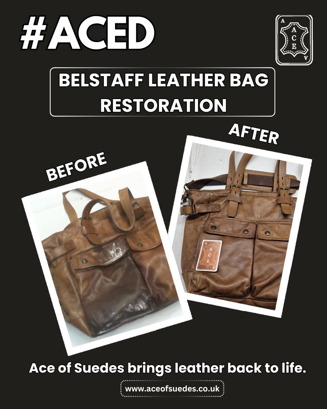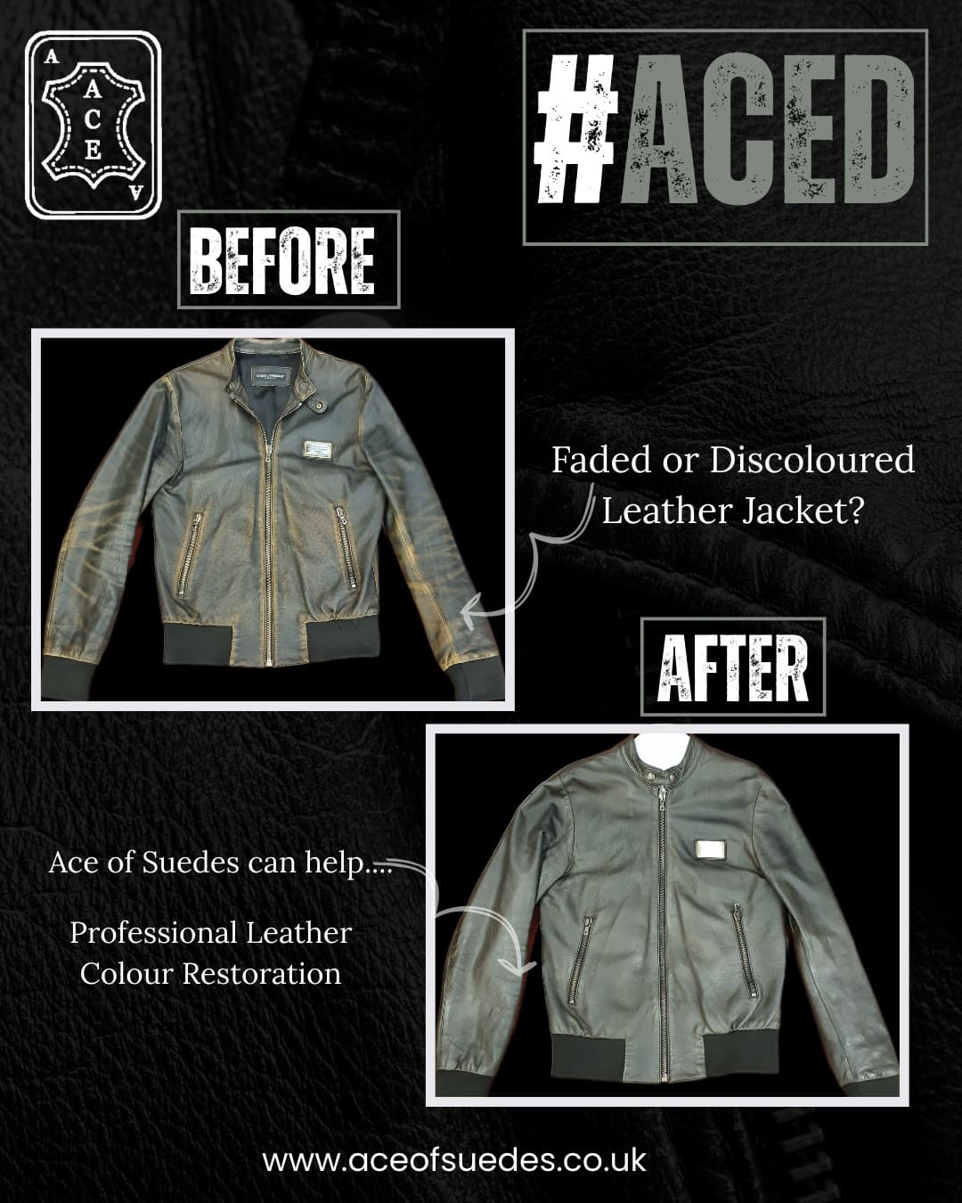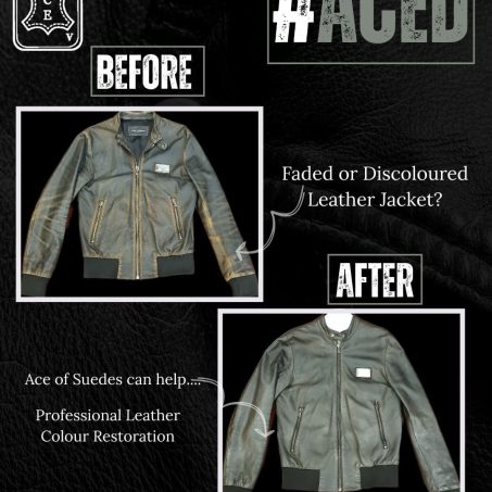 Our specialist treatment and re-oiling process will help to maintain the natural colour and texture of your leather without the risks associated with other cleaning methods. The team at Ace are also able to help restore lost colour and discolouration on a leather garment with the use of oils and leather dyes where necessary.